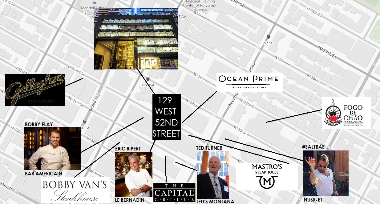 #SALTBAE, Billionaire Ted Turner, and a slew of other celebrity Chefs including Bobby Flay, Eric Ripert, and world famous restaurants like Fogo De Chao, Capital Grille, and Bobby Van's Steakhouse are all a stone's throw from 129 W 52nd Street!!!